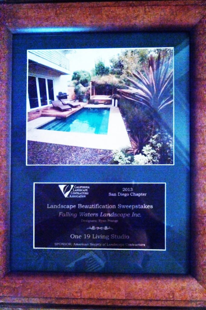 The Beautification awards are annual awards given out by the California Landscape Contractors Association. The awards are split into regions of California. Falling Waters Landscape participated in the San Diego chapter. Our partner company RB Prange inc. also submitted entry’s for the maintenance categories. The Awards are separated into different categories based on size and scope of project as well as for residential and commercial projects. This years ceremony was held on the University of San Diego Campus in the plaza of the Joan B Kroc Institute for Peace & Justice overlooking Mission Bay and the San Diego Harbor. Industry professionals were on hand from both large and small companies with hopes that their projects would be selected for achievements in exemplary landscape design and maintenance.