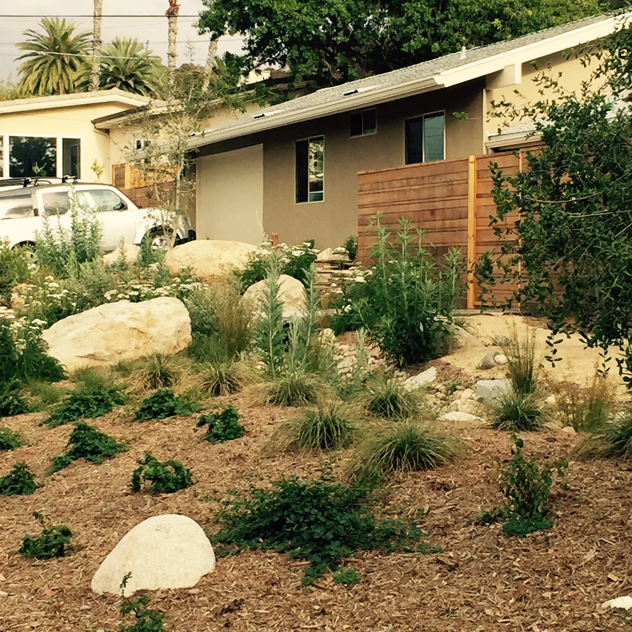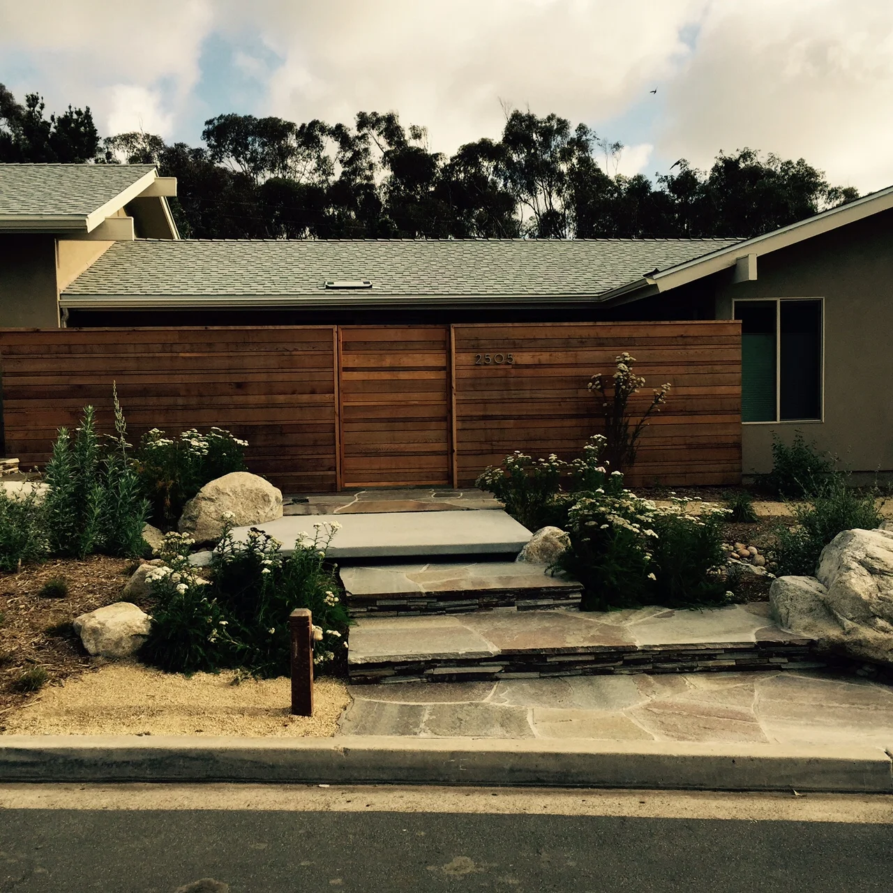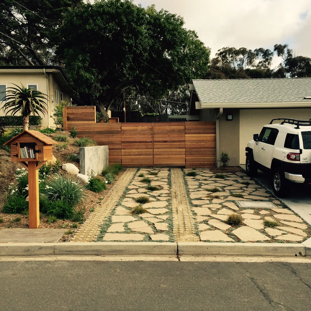 Here are some shots of a recently completed project in La Jolla. 100% California native and edible plant combination. Horizontal Cedar screens and gates, flagstone, pervious paving solutions and a free community library, enjoy!