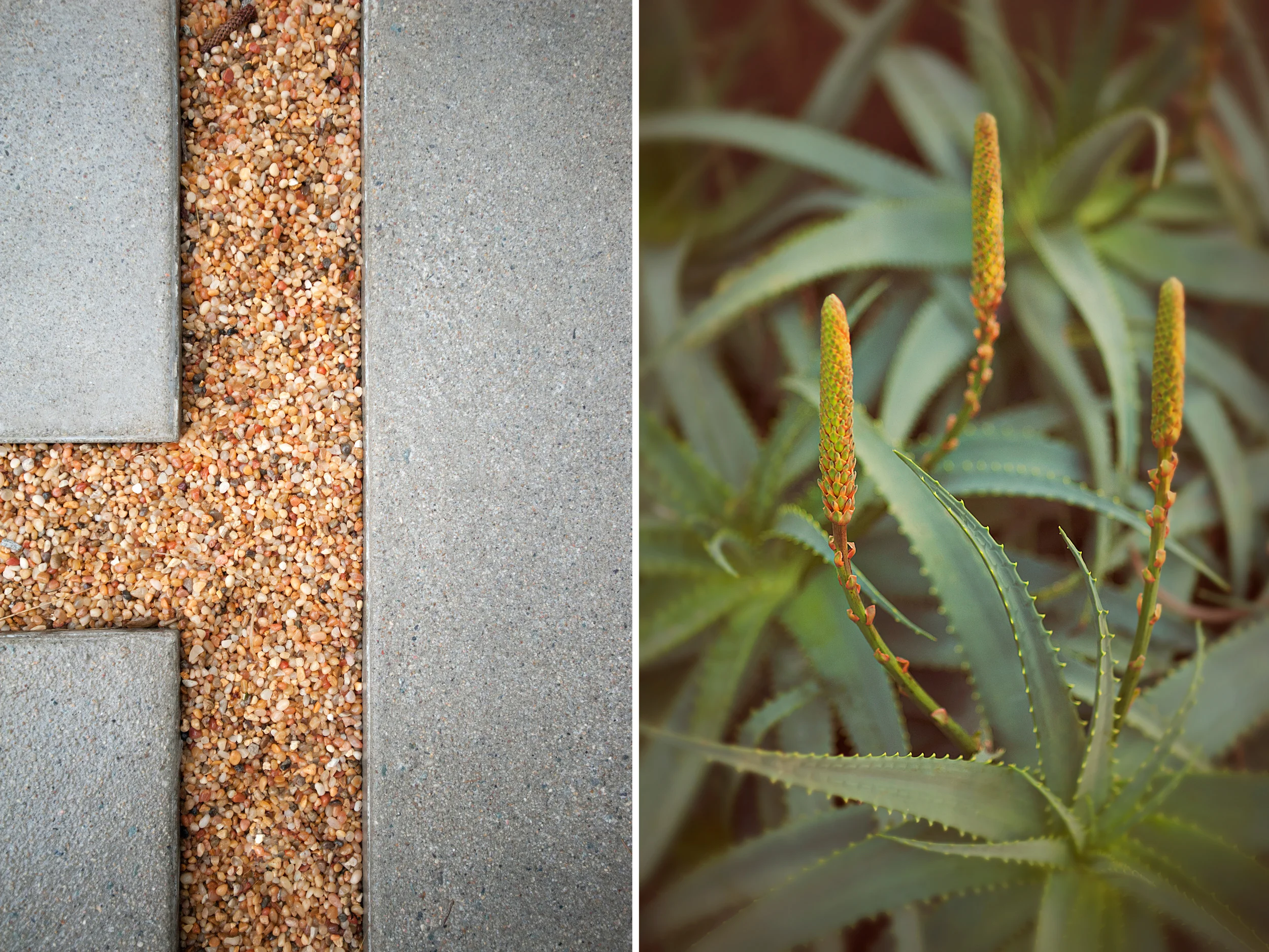 The plantings mix architectural form with coastal softness—aloes, agaves, ponytail palms, and swaying grasses layer texture and motion without crowding the space. The furniture palette introduces moments of play, including a chartreuse dining set that punches through the muted materials with vibrant personality.