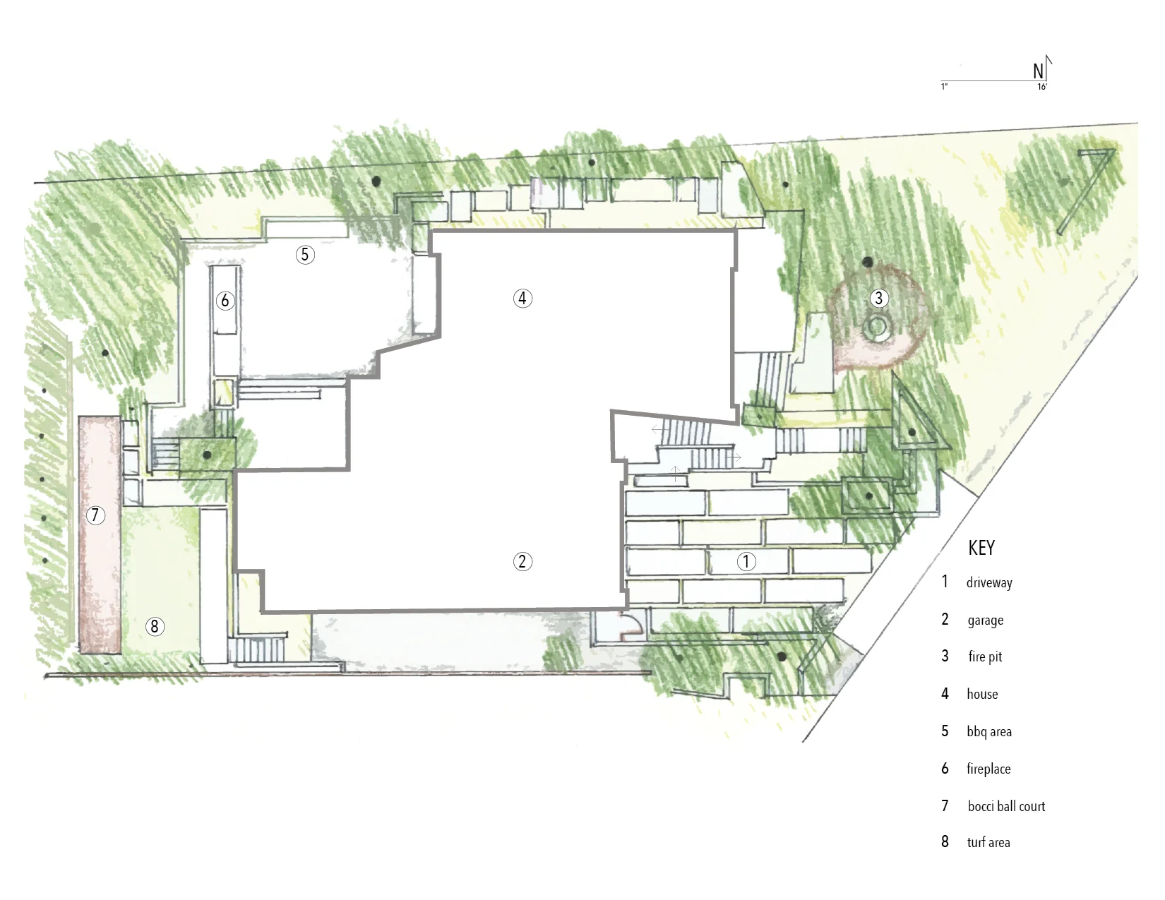 The front yard is defined by restraint and precision. Board-formed concrete planters and stairs lead the approach, paired with steel edging and a palette of grasses, succulents, and vertical bloomers. Corten retaining walls introduce warmth and age, balancing the crisp structure with earthy contrast.