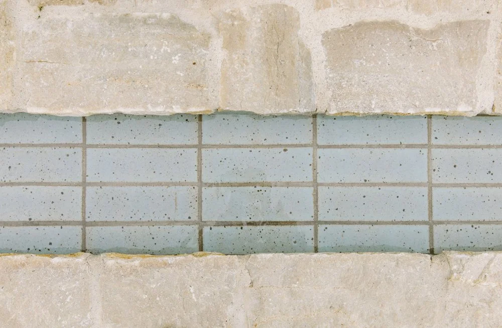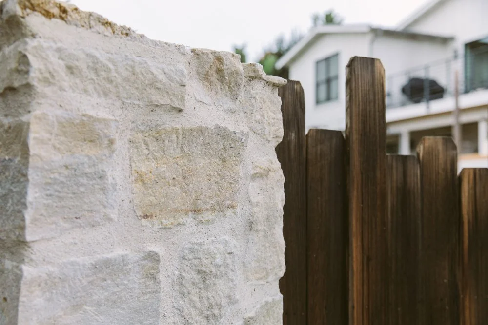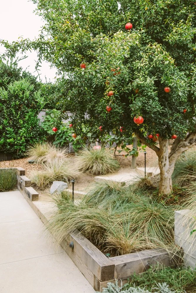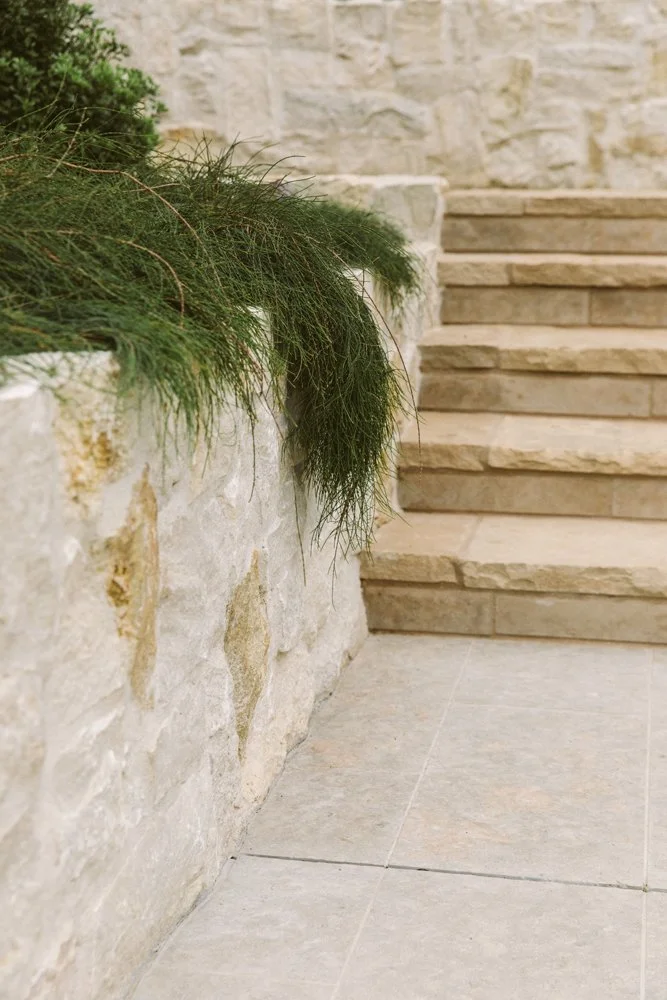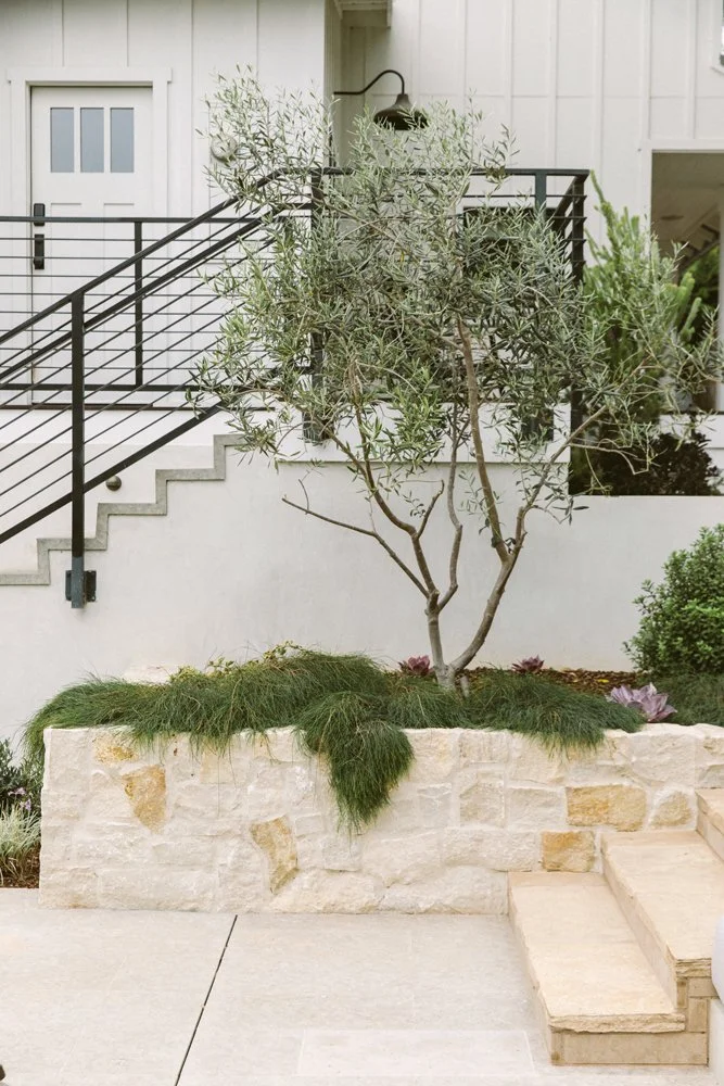 • Materials and Plant Palette Highlights: Limestone and New California clay tile from Cle play nicely together. Grapestake fencing and green ficus