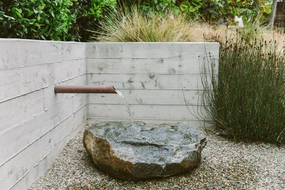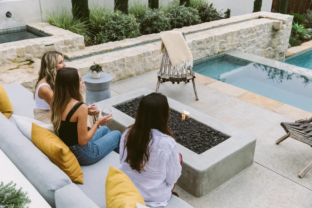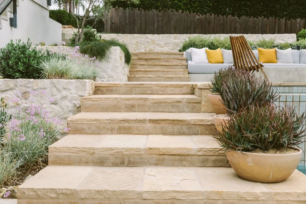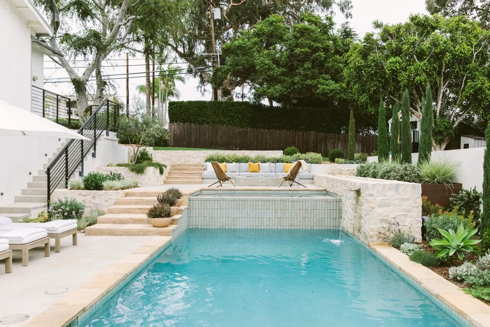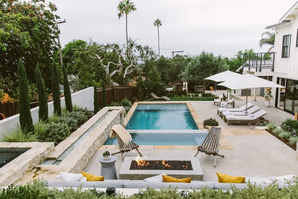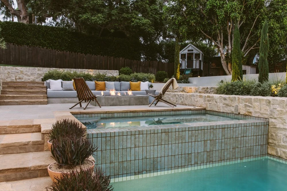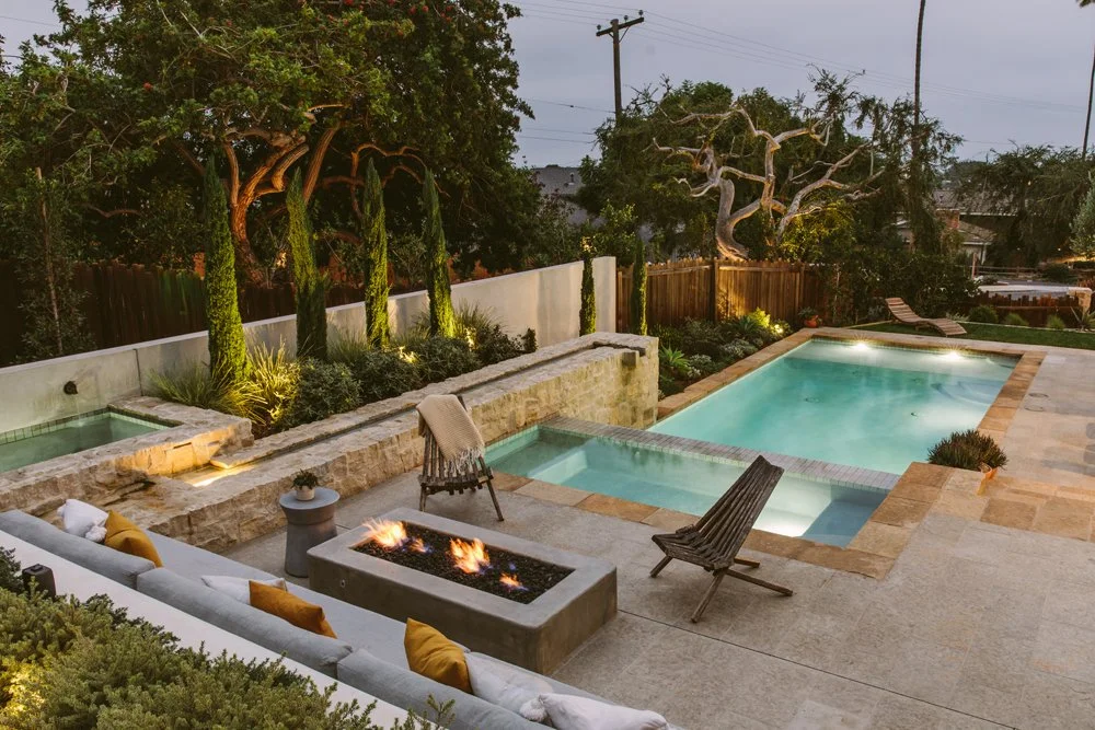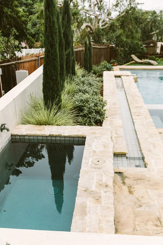 Natural stone and a textured glaze tile soften this multi-level pool. A cold plunge sits at the top, a spa takes its place in the middle next to the firepit, and the pool anchors everything at the bottom. Working with the sloping backyard, water travels down a long linear rill and spills from one space to another. Nature’s elements of water, stone, and plants ground the pool and tie it together. A Mediterranean plant scheme compliments the timeless materials