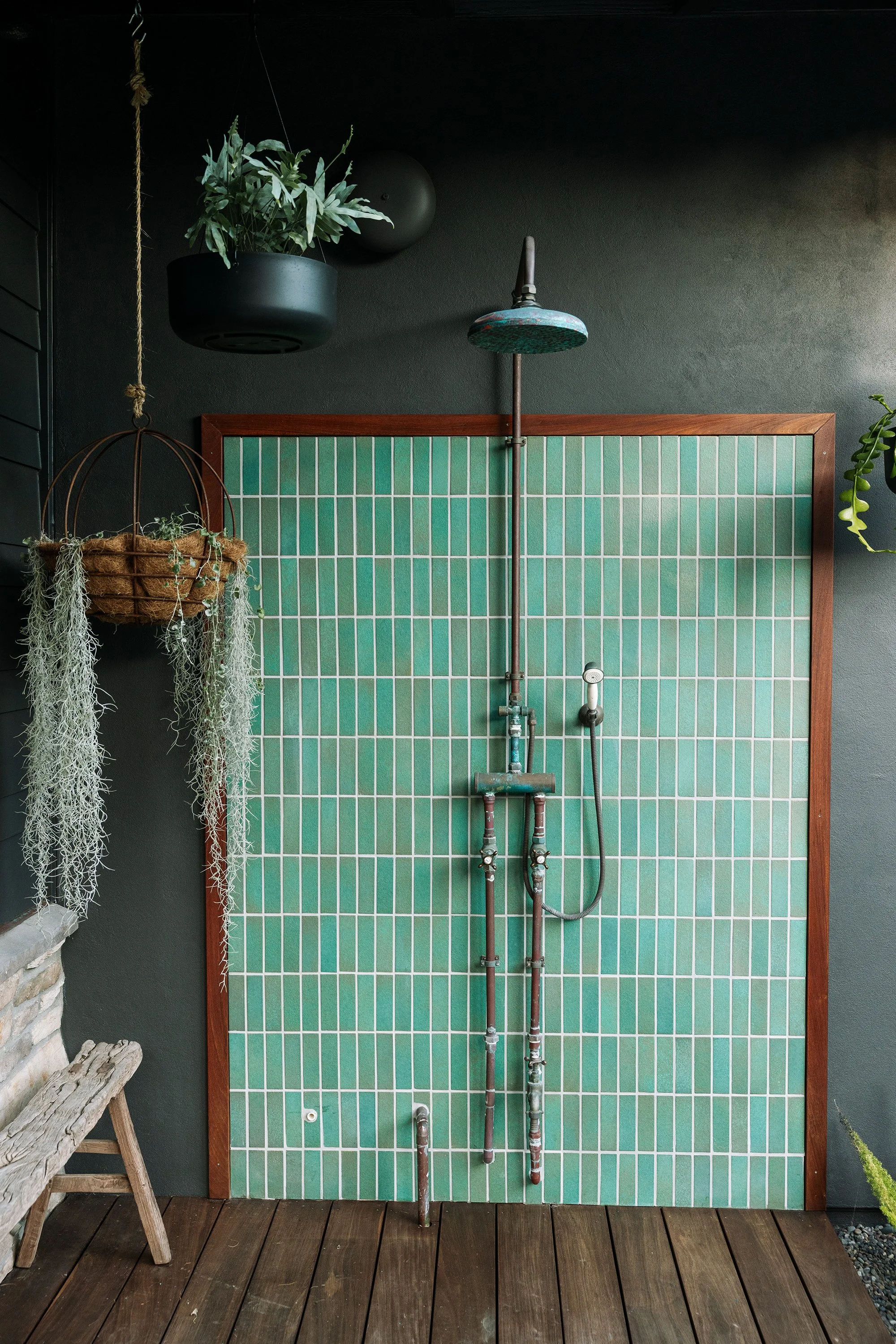 A moody and rich outdoor shower with custom copper trim