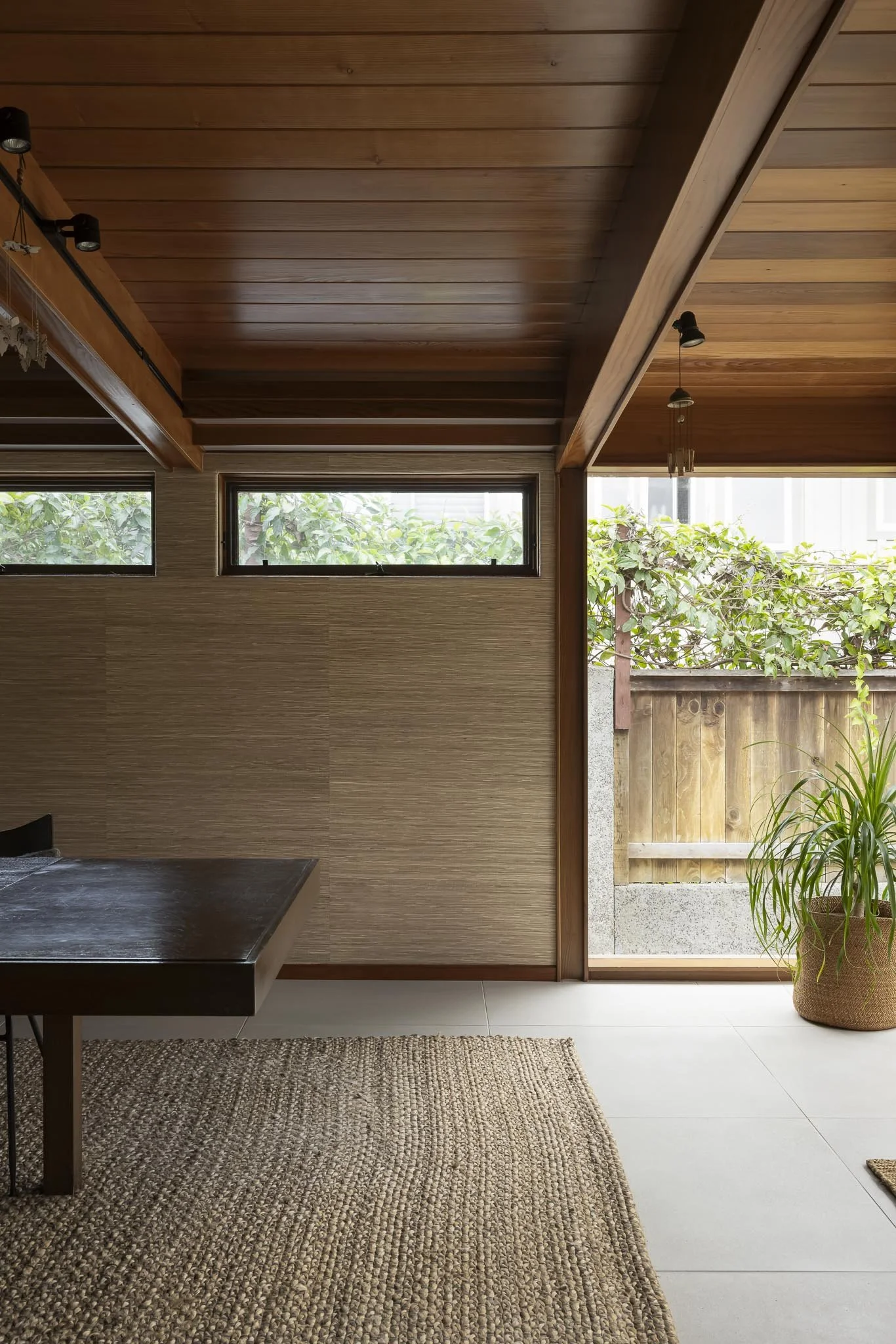 The backyard features moments of discovery: a cedar soaking tub nestled under a vine-wrapped pergola, reclaimed furniture on Ipe decking, and a small grill zone framed by patinaed copper panels and mature foliage. These details bring a handcrafted quality to the space that stands in deliberate contrast to the monolithic feel of the home.
